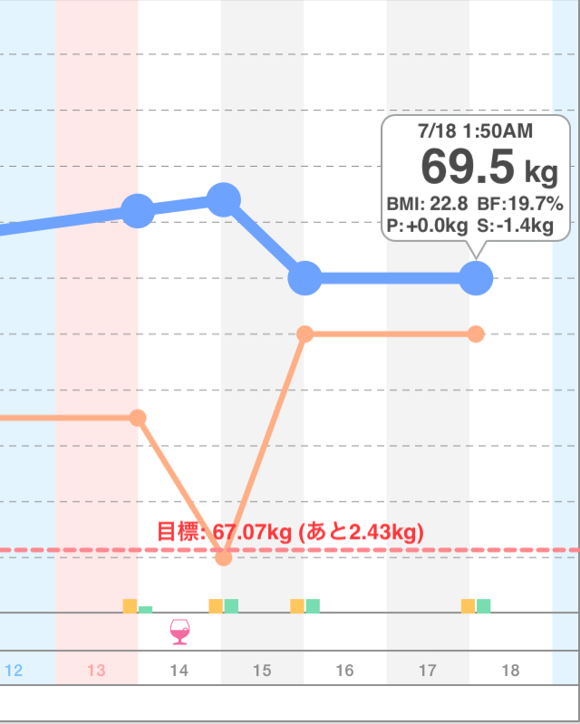 7月16日0時21分から変化なし。現在69.5kg。体脂肪率19.7%。BMIは22.8。酒抜き。