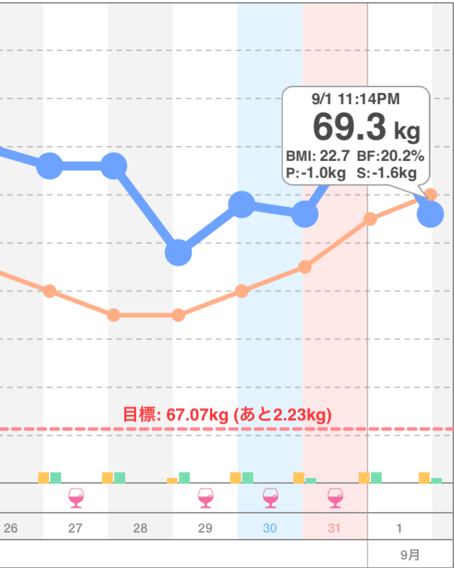 22時間前から1.0kg減!現在69.3kg。体脂肪率20.2%。BMIは22.7。酒抜き。