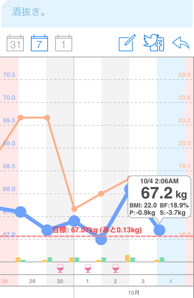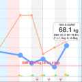 10月1日23:34分から1.1kg増。現在68.1kg。体脂肪率19.6%。BMIは22.3。