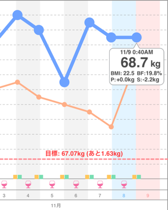 11/8の体重は11月7日23:15分から変化なし。現在68.7kg。