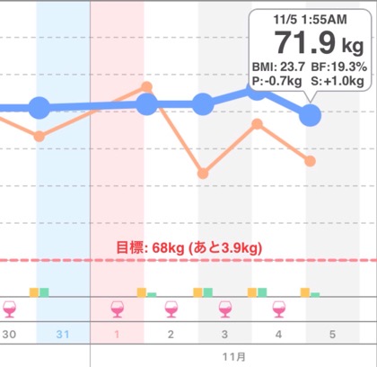 11/4の運動量と体重 Posted on 2015年11月5日2015年11月5日 By kenkoh_houshiPosted in 体重変動と活動記録 晩ごはんの買い物のみ。 現在71.9kg。体脂肪率19.3%。BMIは23.7。 共有:TwitterFacebookLinkedIn ◆関連記事(こちらの記事も読んでみてください) 9/5の体重変動と活動記録 前日のウォーキング2,228歩=1.6km 体重は… 前日のウォーキングは5,083歩=3.6km 前日のウォーキングは3,862歩=2.7km