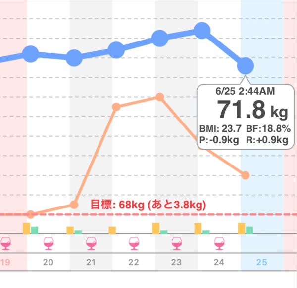 昨日の2時17分から0.9kg減!現在71.8kg。体脂肪率18.8%。BMIは23.7。2013年2月7日から0.9kg増。