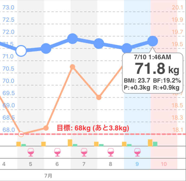 昨日の2時28分から0.3kg増。現在71.8kg。体脂肪率19.2%。BMIは23.7。2013年2月7日から0.9kg増。