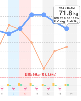 昨日の0時55分から0.4kg減!現在71.8kg。体脂肪率18.8%。BMIは23.6。