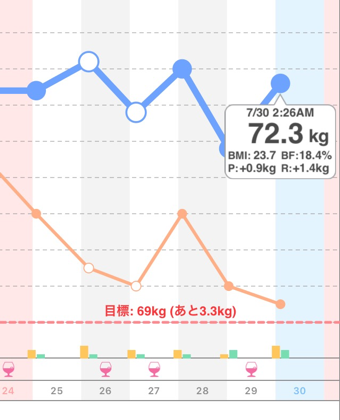 昨日の0時53分から0.9kg増。現在72.3kg。体脂肪率18.4%。BMIは23.7。