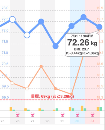 昨日の0時53分から0.9kg増。現在72.3kg。体脂肪率18.4%。BMIは23.7。