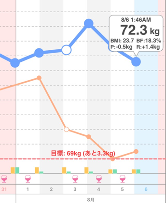 昨日の2時01分から0.5kg減!現在72.3kg。体脂肪率18.3%。BMIは23.7。