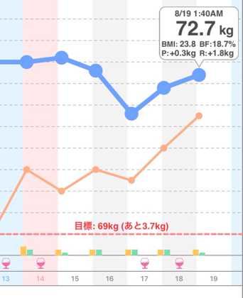 昨日の1時20分から0.3kg増。現在72.7kg。体脂肪率18.7%。BMIは23.8。