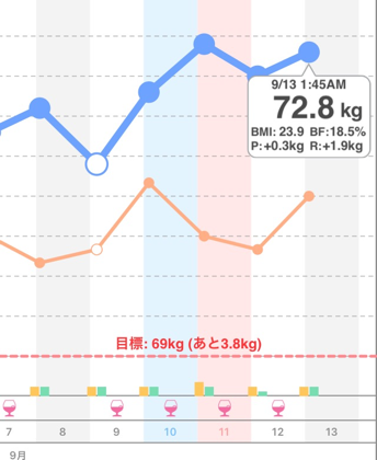 昨日の2時49分から0.3kg増。現在72.8kg。体脂肪率18.5%。BMIは23.9。