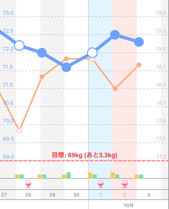 昨日の2時16分から0.2kg減!現在72.3kg。体脂肪率18.8%。BMIは23.7。