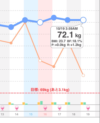 昨日の1時34分から変化なし。現在72.1kg。体脂肪率18.1%。BMIは23.7。