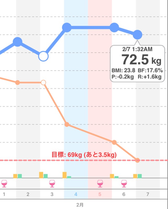 昨日の2時17分から0.2kg減!現在72.5kg。体脂肪率17.6%。BMIは23.8。