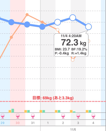 前の日に飲み過ぎたので…。 本日の歩数 4588歩。 本日の体重と体脂肪率 昨日の4時20分から0.2kg減!現在72.1kg。体脂肪率20.1%。BMIは23.7。  …